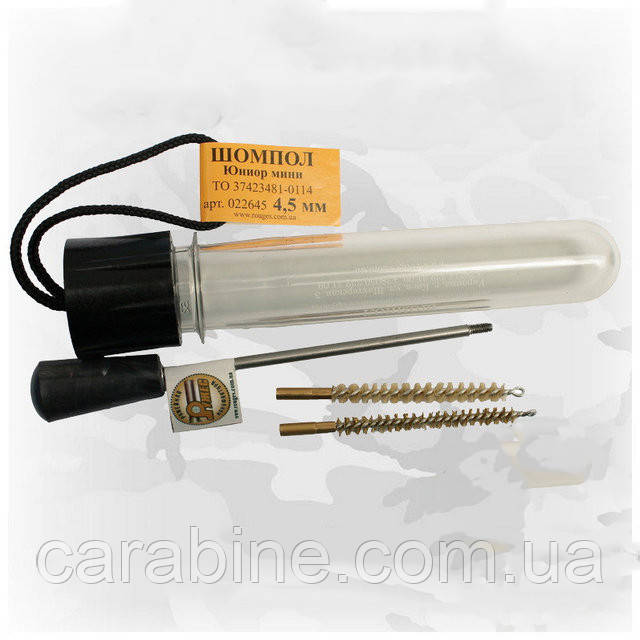 Похідний набір для чищення нарізного короткодульного (довжина не більш ніж 100 мм) зброї калібру 4,5 мм. У зручний тубус упакований обертовий шомпол зі стрижнем із неіржавкої сталі та пластиковою ручкою з алюмінієвим підшипником ковзання, йорж латунний і волосяний 4,5 мм Призначений для пневматичних пістолетів.